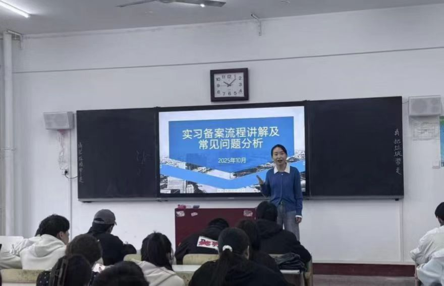 最后,学院实训中心主任刘倩斐就河南省教育厅实习管理平台的操作流程和实习材料准备要求进行了现场演示与讲解,详细介绍了线上实习平台的使用方法,包括每日打卡、周志提交、实习报告上传,要求全体同学按时、规范地提交各项电子材料;同时,也明确了实习单位鉴定、实习总结报告等纸质材料的准备规范与提交时间节点,为实习过程管理和最终考核评价提供了清晰指引。
